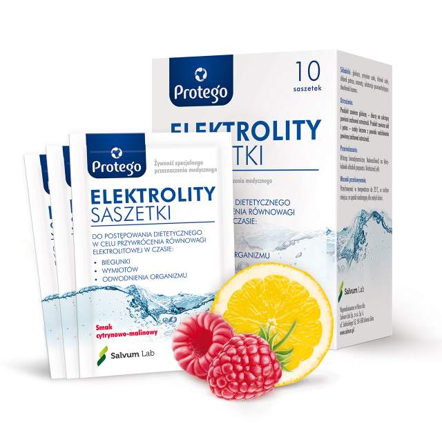 Protego Elektrolity saszetki to suplement diety o smaku malinowo cytrynowym w postaci proszku do sporządzania doustnego, stosowany w celu przywrócenia równowagi elektrolitowej w organizmie.