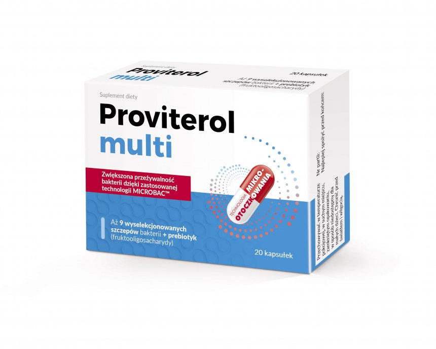 Proviterol Multi 20 kapsułek / Suplement diety kapsułki Połączenie aż 9 wyselekcjonowanych szczepów bakterii + prebiotyku (fruktooligosacharydy). Dzięki technologii MICROBAC™ bakterie zyskują 5-krotnie zwiększoną odporność na kwasy żołądkowe, co zapewnia ich większą przeżywalność. Skład Wskazania Jak stosować Informacje dodatkowe Skład porcji zalecanej do spożycia w ciągu dnia: Składnik Ilość w dziennej porcji (1 kapsułka) Lactococcus lactis LLC02 13,2 x 10⁸ CFU* Lactobacillus plantarum LP09 2,64 x 10⁸ CFU* Lactobacillus rhamnosus GG 1,32 x 10⁸ CFU* Streptococcus thermophilus Y08 0,88 x 10⁸ CFU* Bifidobacterium breve BR03 0,88 x 10⁸ CFU* Lactobacillus casei LC03 0,44 x 10⁸ CFU* Bifidobacterium bifidum BB01 0,88 x 10⁸ CFU* Bifidobacterium animalis ssp. Lactis BS01 21,56 x 10⁸ CFU* Lactobacillus acidophilius LA02 2,2 x 10⁸ CFU* Fruktooligosacharydy 63 mg *CFU – Colony Forming Unit – jednostka tworząca kolonię Składniki: substancja wypełniająca: maltodekstryna; składnik kapsułki: hypromeloza; prebiotyk: fruktooligosacharydy; Bifidobacterium animalis ssp. lactis BS01, Lactococcus lactis LLC02, substancja przeciwzbrylająca: stearynian magnezu; Lactobacillus plantarum LP09, Lactobacillus acidophilius LA02, Lactobacillus rhamnosus GG, Streptococcus thermophilus Y08, Bifidobacterium breve BR03, Bifidobacterium bifidum BB01, substancja przeciwzbrylająca: dwutlenek krzemu; Lactobacillus casei LC03. Proviterol MULTI to suplement diety zawierający kompleksową formułę 9 mikrootoczkowanych szczepów bakterii probiotycznych z prebiotykiem (fruktooligosacharydy). Technologia MICROBAC™ zwiększa odporność bakterii na działanie kwasów żołądkowych. Starannie dobrane składniki wspierają równowagę mikroflory jelitowej, szczególnie w trakcie i po antybiotykoterapii, w podróży i w okresach obniżonej odporności (sezon jesienno-zimowy). Zalecana dzienna porcja do spożycia: dorośli i dzieci powyżej 3. roku życia - 1 kapsułka. W przypadku stosowania produktu u dzieci, kapsułkę należy otworzyć, a następnie rozpuścić jej zawartość w zimnym lub letnim płynie (np. w wodzie, herbacie, mleku) i podać do spożycia bezpośrednio po przygotowaniu. Ostrzeżenia: Nie należy przekraczać zalecanej porcji w ciągu dnia. Nie należy stosować w przypadku nadwrażliwości na którykolwiek ze składników preparatu. Suplement diety nie może być stosowany jako substytut (zamiennik) zróżnicowanej diety. Zrównoważony sposób żywienia i zdrowy tryb życia są ważne dla utrzymania prawidłowego stanu zdrowia. Przechowywać w temperaturze pokojowej, w suchym miejscu, zamkniętym opakowaniu, w sposób niedostępny dla małych dzieci. Chronić przed światłem i wilgocią. Opakowanie 20 kapsułek kod kreskowy: 5905108790561 Wyprodukowano w Polsce dla: Salvum Lab sp. z o.o. ul. Sobieskiego 53 58-500 Jelenia Góra www.salvum.pl nowość Sprawdź gdzie kupić Jesteś Pacjentem sprawdź najlepsze ceny